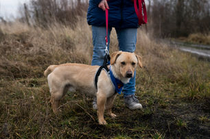 BISZKOPT ma półtora roku. Biegał po Niepruszewie z obrożą i smyczą. Bardzo trudno było go złapać, był przestraszony i bardzo nieufny.